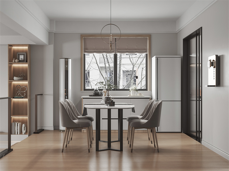 浅木色地板搭配浅灰调柜体,营造温润氛围。弧形餐桌与同色系绒面餐椅线条柔和,简洁精致。侧边展示柜内嵌灯光,陈列摆件增添艺术感。