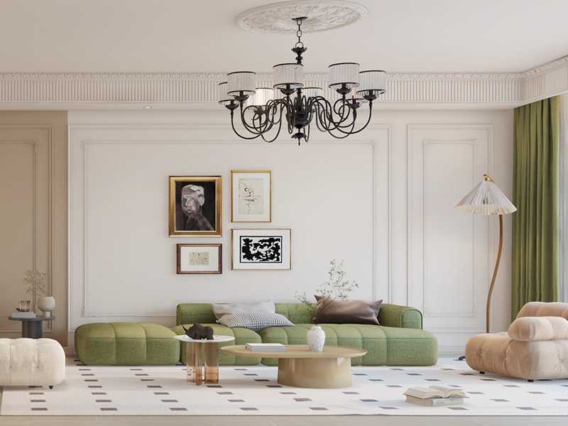 米白基调搭配黑铜复古吊灯,雕花吊顶与艺术摆件尽显优雅。日常会客休闲时,既借复古家具营造社交仪式感,又以柔和色彩传递松弛氛围,是兼具优雅与温度的互动场域,适配品质待客与家庭欢聚。