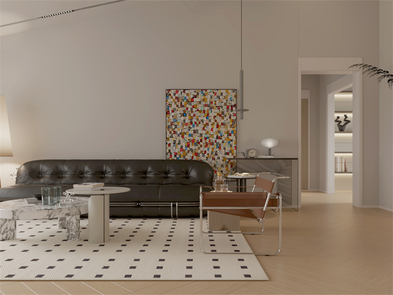 黑白灰与米色主调,黑色皮沙发、大理石茶几搭配艺术挂画,空间通透利落。日常社交休闲时,极简布局传递优雅时尚质感,材质碰撞营造松弛互动场,适配观影、闲谈,在克制设计中尽显现代舒适的居住体验。