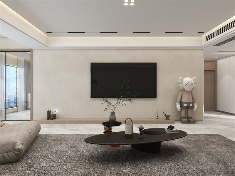 以暖米为基底,电视墙做微肌理处理,搭配悬浮地台,弱化厚重感,不规则异形茶几用黑+金属细节提升精致度,柔纹地毯中和冷硬感。通过艺术摆件注入个性。