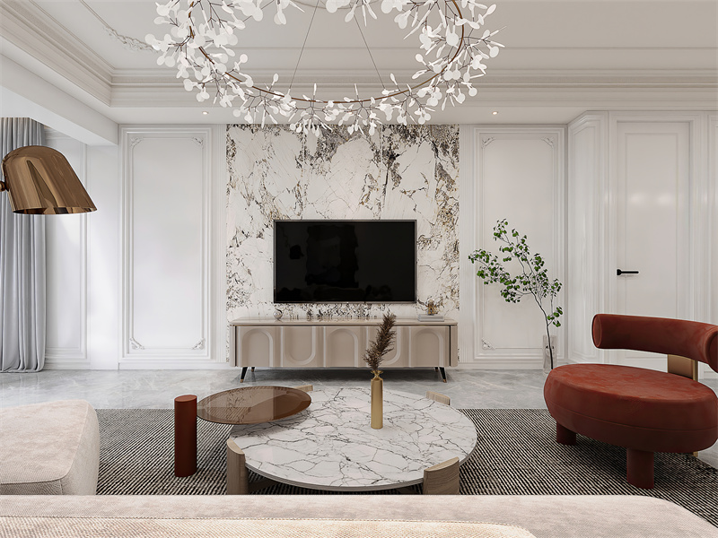 以纯白为基底,通过石膏线条、雕花吊顶复刻法式优雅,同时用大理石纹背景墙弱化传统法式的厚重感。焦糖色单人椅作为跳色亮点,平衡空间的清冷感。