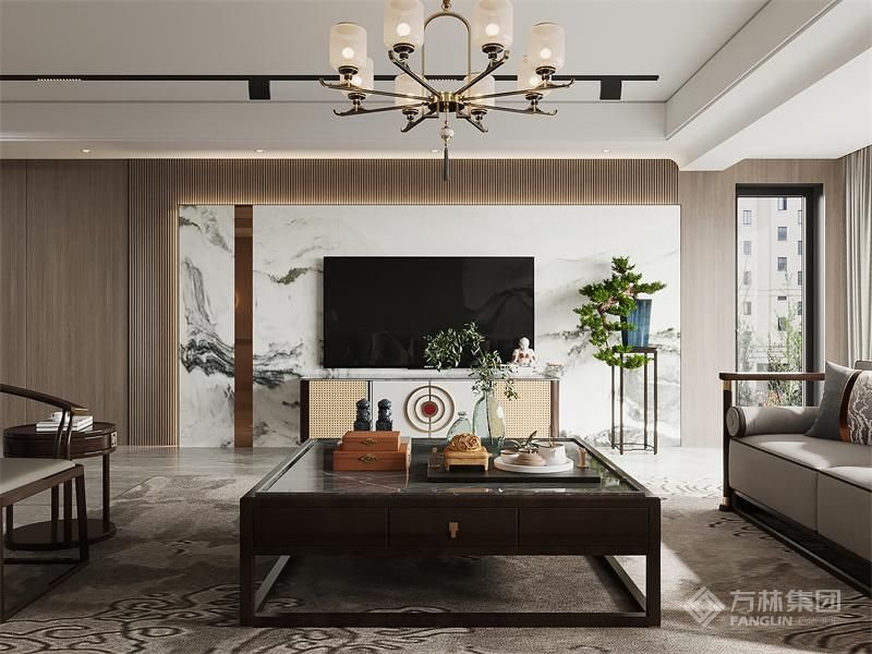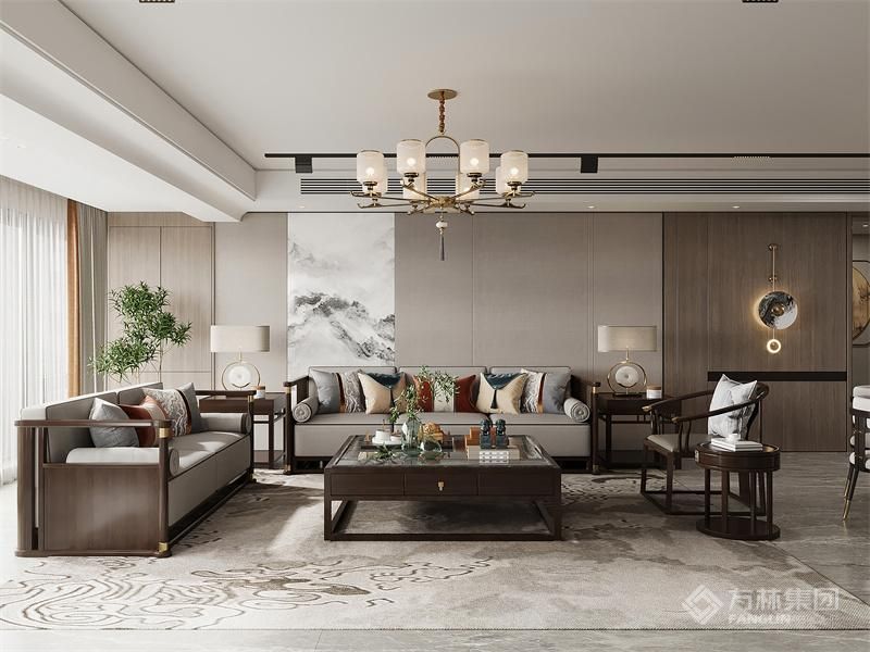 本案是现代中式设计,以现代人的审美需求打造富有传统韵味的空间。家具材质沉稳,呈现东方情调,空间整体感更轻松自然。