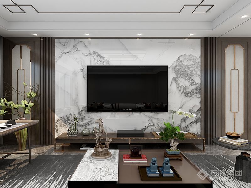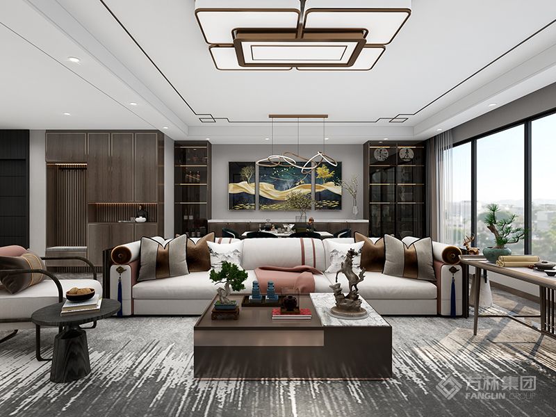 本案是现代中式设计,以现代人的审美需求打造富有传统韵味的空间。家具材质沉稳,呈现东方情调,空间整体感更轻松自然。