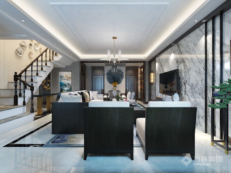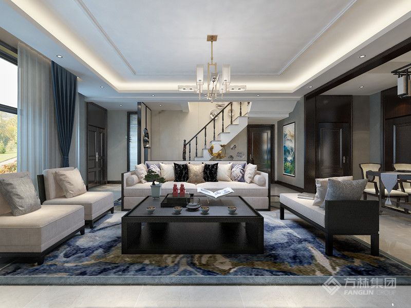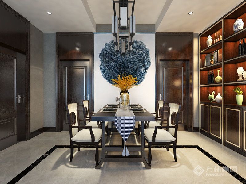 本案是现代中式设计,以现代人的审美需求打造富有传统韵味的空间。家具材质沉稳,呈现东方情调,空间整体感更轻松自然。