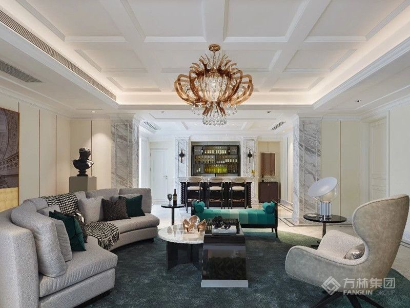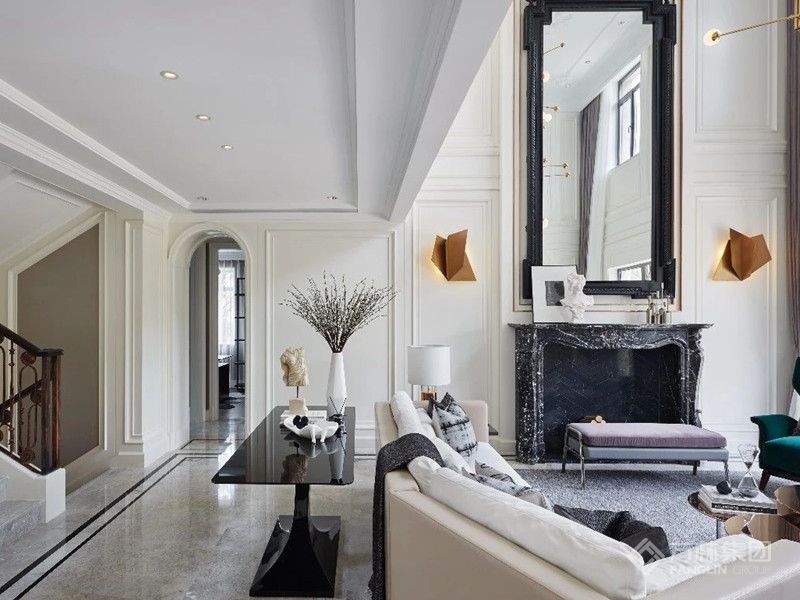 张雪松光洁的仿大理石瓷砖与绒缎质感的沙发饱和了视觉的冲击,精致典雅,贵气大方。。